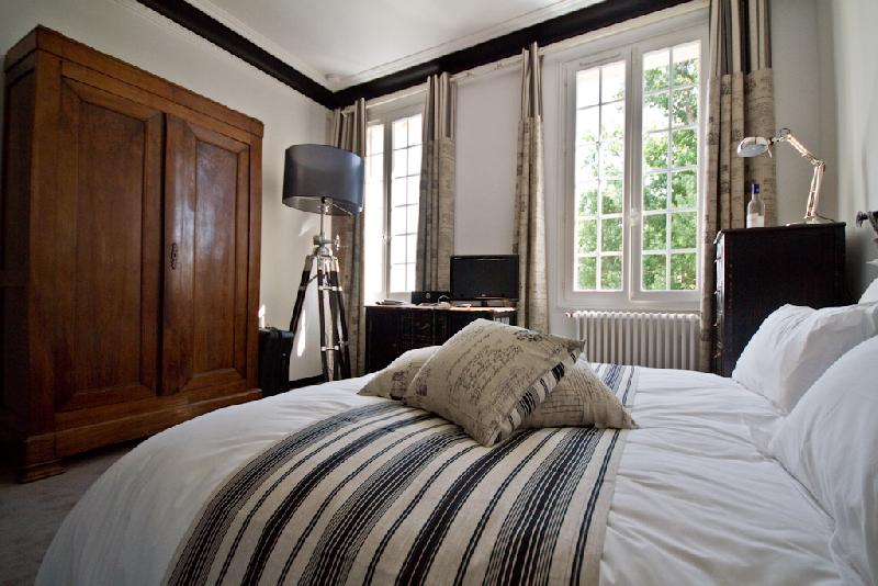 Vous apprécierez dans cette chambre la hauteur de plus de 3m du plafond ainsi que son mobilier qui évoque une époque révolue ; le tout relevé avec finesse et un brin d’humour par une décoration décalée.