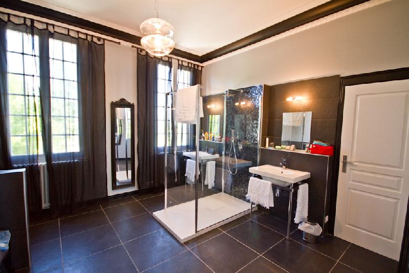 Vous profiterez de la plus grande salle d’eau de l’hôtel avec une grande douche vitrée, 2 vasques, commode à l’ancienne et fauteuils et WC.